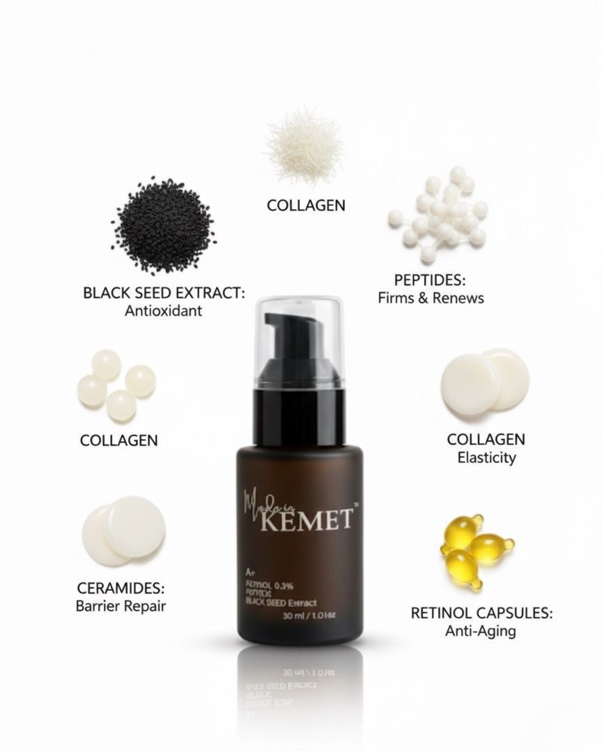 Reawaken your skin’s vitality with Kemet Retinol Renewal Serum, a refined formula combining 0.3% Retinol, Black Seed Extract, and Peptides to reduce fine lines, refine texture, and boost collagen renewal. The serum is balanced with Ceramides and Panthenol to ensure optimal comfort and minimal irritation.